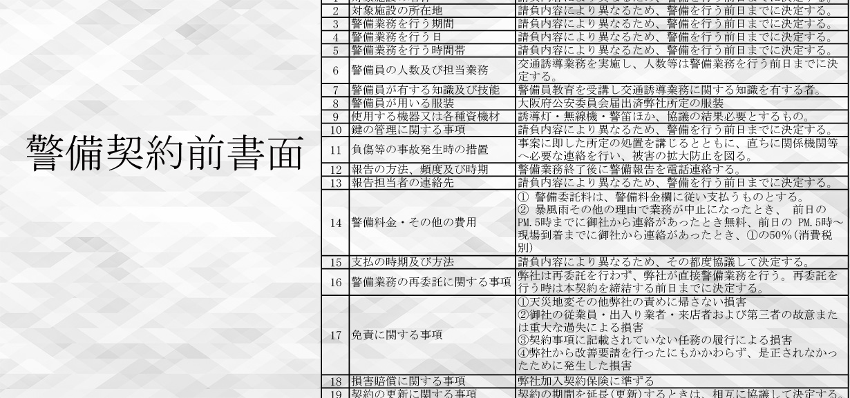 『安全』が私たちのノルマです。あなたの安全を守ることはあなたの先の誰かの笑顔、そしてまた、その先の誰かの笑顔を守れる事を大切に考え日々の警備を実行してまいります。また、警備業を通じてプラスアルファーのサービスを創造し提供していくことにより、弊社と関わる全てのお客様、またはパートナー様に貢献いたします。